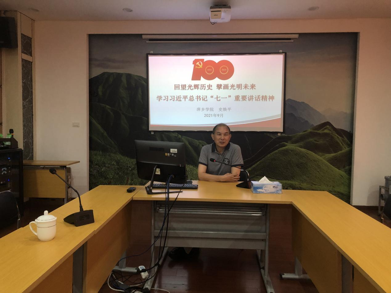 史焕平要求,全体师生党员要深刻领会和把握习近平总书记“七一”重要讲话的重大意义、丰富内涵、核心要义和实践要求;要坚定理想信念,吃透内涵精髓,切实把思想和行动统一到讲话精神上来,真正用来武装头脑、指导实践、推动学院工训中心搬迁、专业综合评价、产学研服务地方发展等重点工作落实;要持续推进深入学党史、悟思想、办实事、开新局,立足学校应用转型发展之基,真抓实干,以奋发有为的状态和攻坚克难的姿态,服务国家科技与人才战略,服务地方经济转型发展,推进学校教育高质量跨越式发展,奋力谱写特色突出优势明显的应用型大学新篇章。