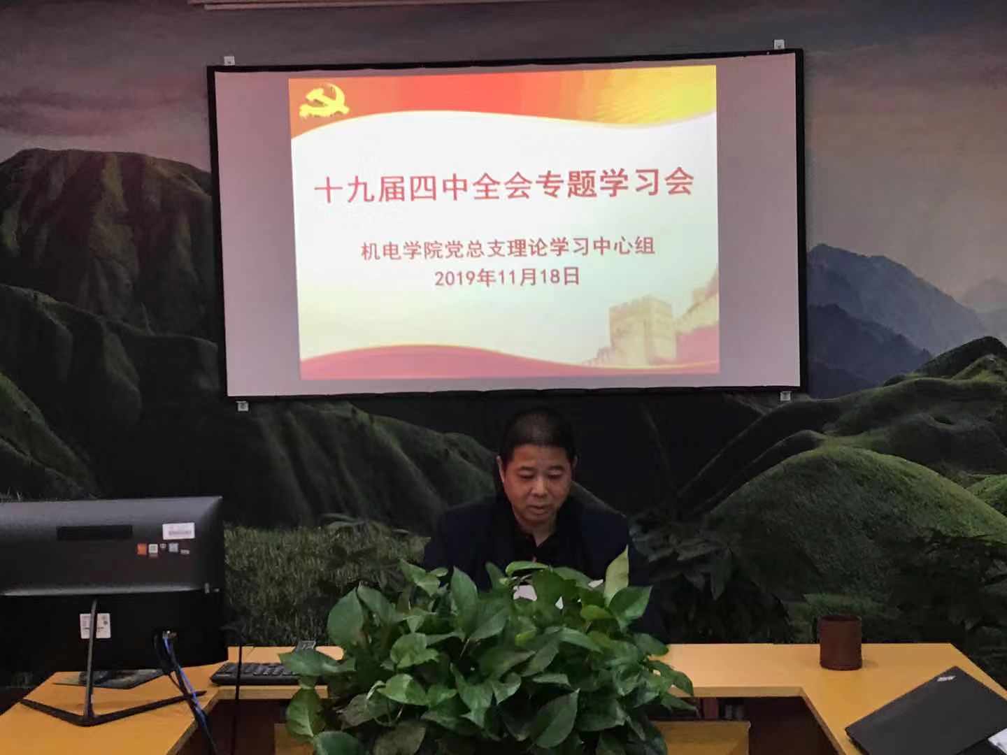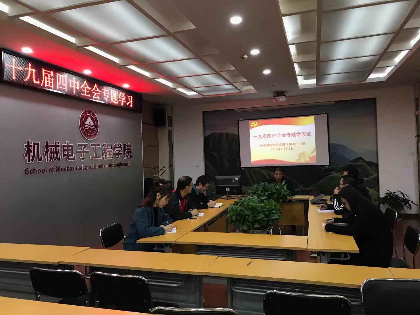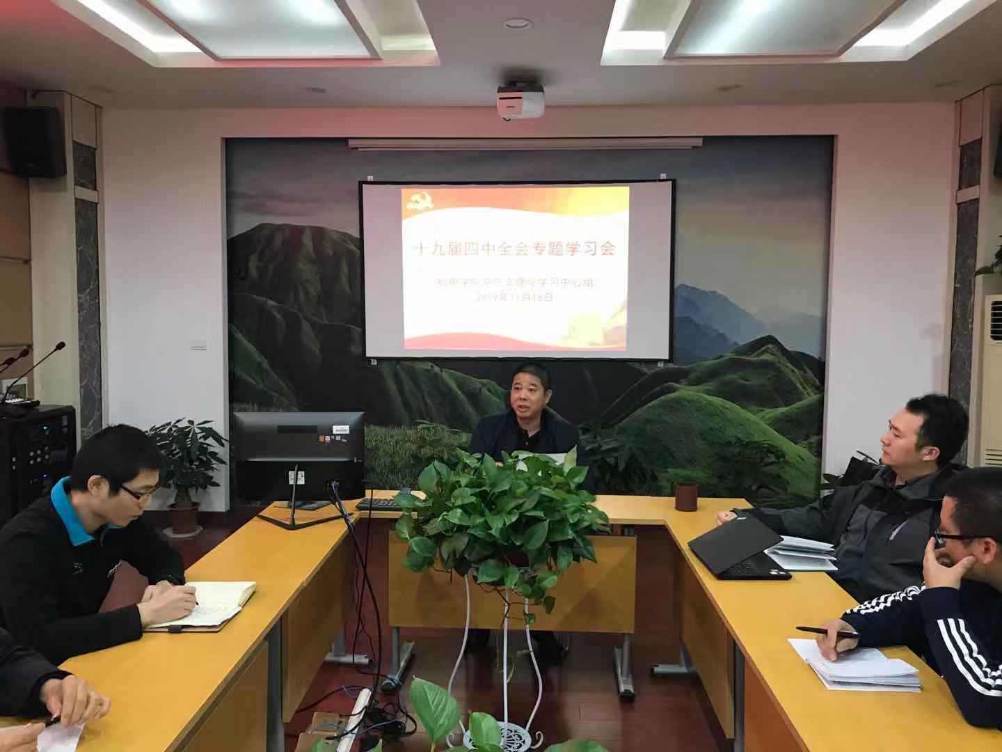 2019年11月18日,机械电子工程公司理论学习中心组召开专题会议,学习十九届四中全会精神。公司党总支书记王斌主持会议,学院理论中心组成员参加。