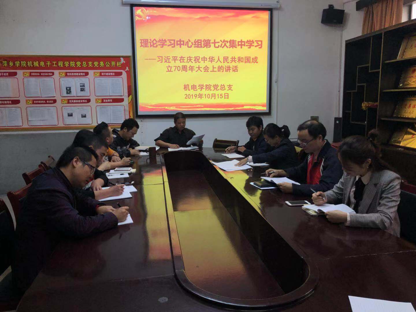 2019年10月15日,机械电子工程公司理论学习中心组召开专题学习会议,学习习近平总书记在庆祝中华人民共和国成立70周年大会上的讲话精神。公司党总支书记王斌主持会议,学院理论中心组成员参加。