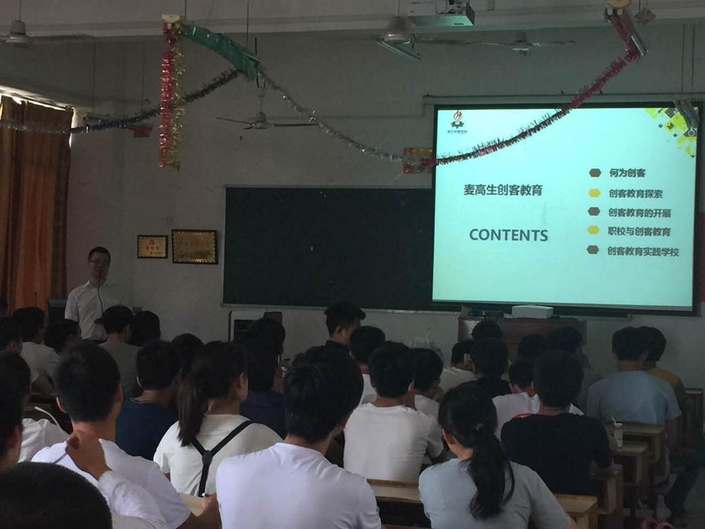 员工易江涛毕业于外国语学院,目前在深圳麦高生科技有限公司从事创客教育工作,深圳市麦高生科技有限公司是一家长期从事国内外办公设备及打印耗材的研发、生产与销售工作的公司,现转型研发和生产桌面3D打印机、3D打印耗材,畅销国内外3D市场,在消费者当中享有较高的地位。这次他和他的两位同事带来了分别给我们介绍了创客,创客教育、VR、以3D打印。他们的介绍简单易懂,向大家普及了创客的定义,什么是创客教育,3D打印的工作原理以及3D打印的作用,还有VR技术在目前教育上的使用等等。这些都让同学们听得如痴如醉,受益匪浅。