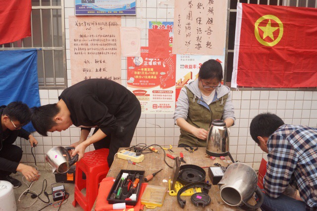 上午,活动人员刚将维修器材准备就绪,吸引了大批村民前来询问和维修。不久,桌面上就堆满了热水壶、电饭煲、电风扇、手电筒等各种家电,维修员们一一耐心解答,有条不紊的进行维修。他们坚守岗位,一丝不苟地维修着村民们的各种电器,一直到下午三点。村民们对于此次义务维修活动给予了高度的肯定和表扬,鼓励同学们继续坚持践行雷锋精神,发扬志愿者服务精神。