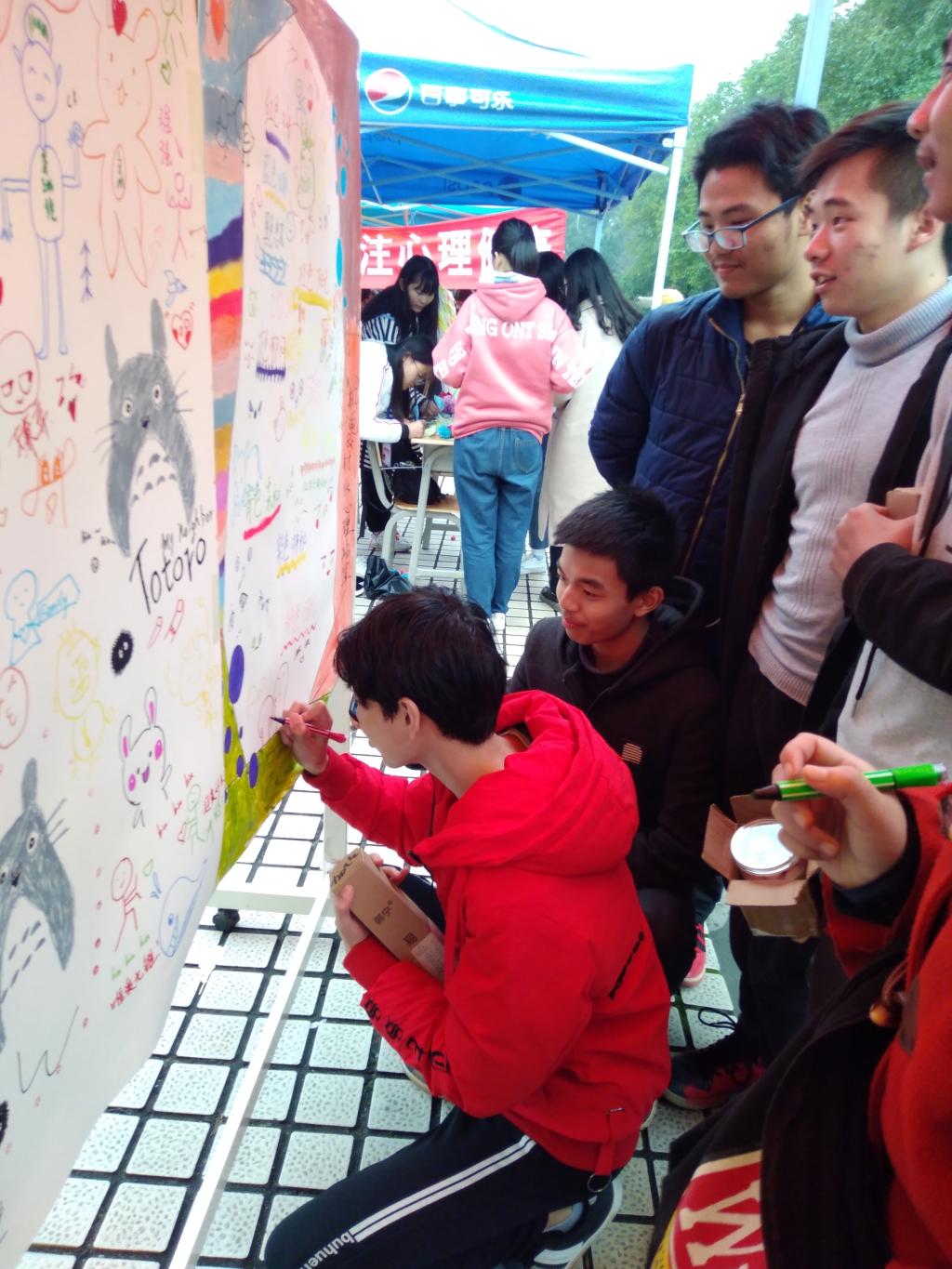 天蒙蒙亮,两个学院心理站的成员便去中心小广场布置场地,因蒙蒙细雨中他们搭起了帐篷伞,摆起了他们情绪化笔的展板,他们热情饱满,期待着同学们的到来。他们希望通过情绪化笔让同学们表达出自己的心情。微寒的天里燃起了热情的焰,同学们纷至沓来。有的画漂亮开心的小姐姐,有的画可爱懵逼的猪猪,有的画愤怒不可挡的小人儿,有的话忧伤安静的猫咪……同学们感受到了情绪表达后的快乐。把苦闷忧伤留在画板上,你可以带着舒畅愉快离开;把开心快乐留在画板上,你可以用快乐感染他人。