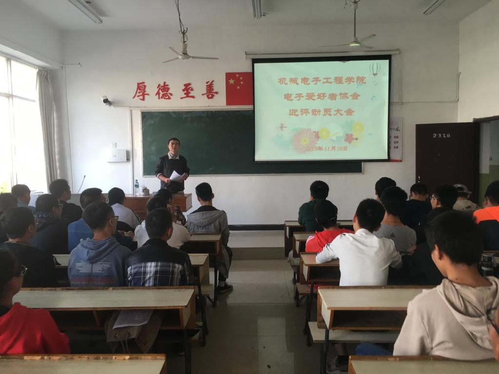 为了进一步全面落实迎评冲刺工作,扎实做好动员工作,2019年11月10日下午,电子爱好者协会在鼎新楼2316举行了迎评动员大会。动员大会由协会指导老师胡子健主持。