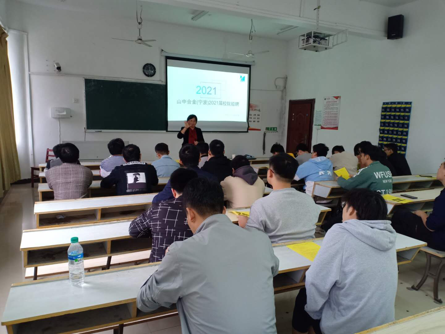 2020年10月20日下午,机电学院于2216教室召开山中合金(宁波)有限公司专场招聘会,2021届机械设计制造及其自动化、机械电子工程专业毕业生参加了招聘会。该公司的副总经理李静给员工进行宣讲。