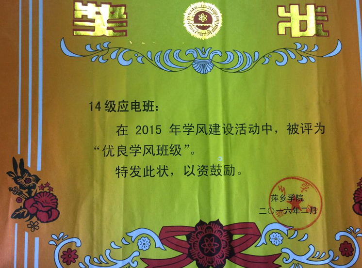 机电学院14应用电子班在2016年4月荣获2015年学风建设活动中“优良学风班级”称号。过去的一年,14应用电子班围绕校院、党团部门以及各行政单位的工作部署,创造性地完成了各项工作任务,在思想引领、成长服务、组织建设、服务社会、学习建设等方面取得了一系列可喜的成绩。在2015年3月太阳成集团官方网站雷锋月“践行社会主义核心价值观,争创时代先锋人”活动中荣获“太阳成集团官方网站雷锋班”称号。在2015年11月太阳成集团官方网站表彰了践行社会主义核心价值观“标兵团支部”和“十佳特色团支部”,14应用电子班获此殊荣。