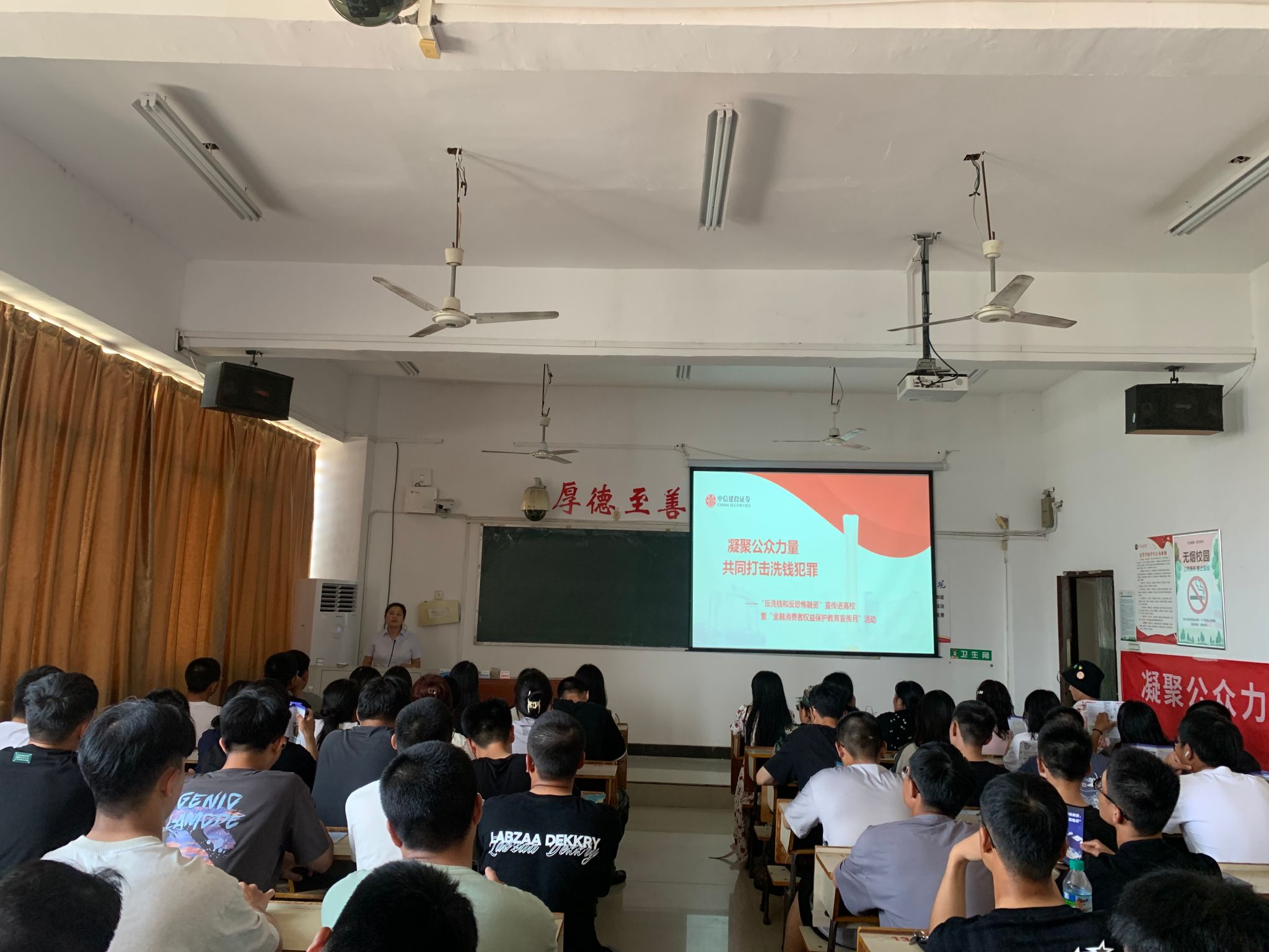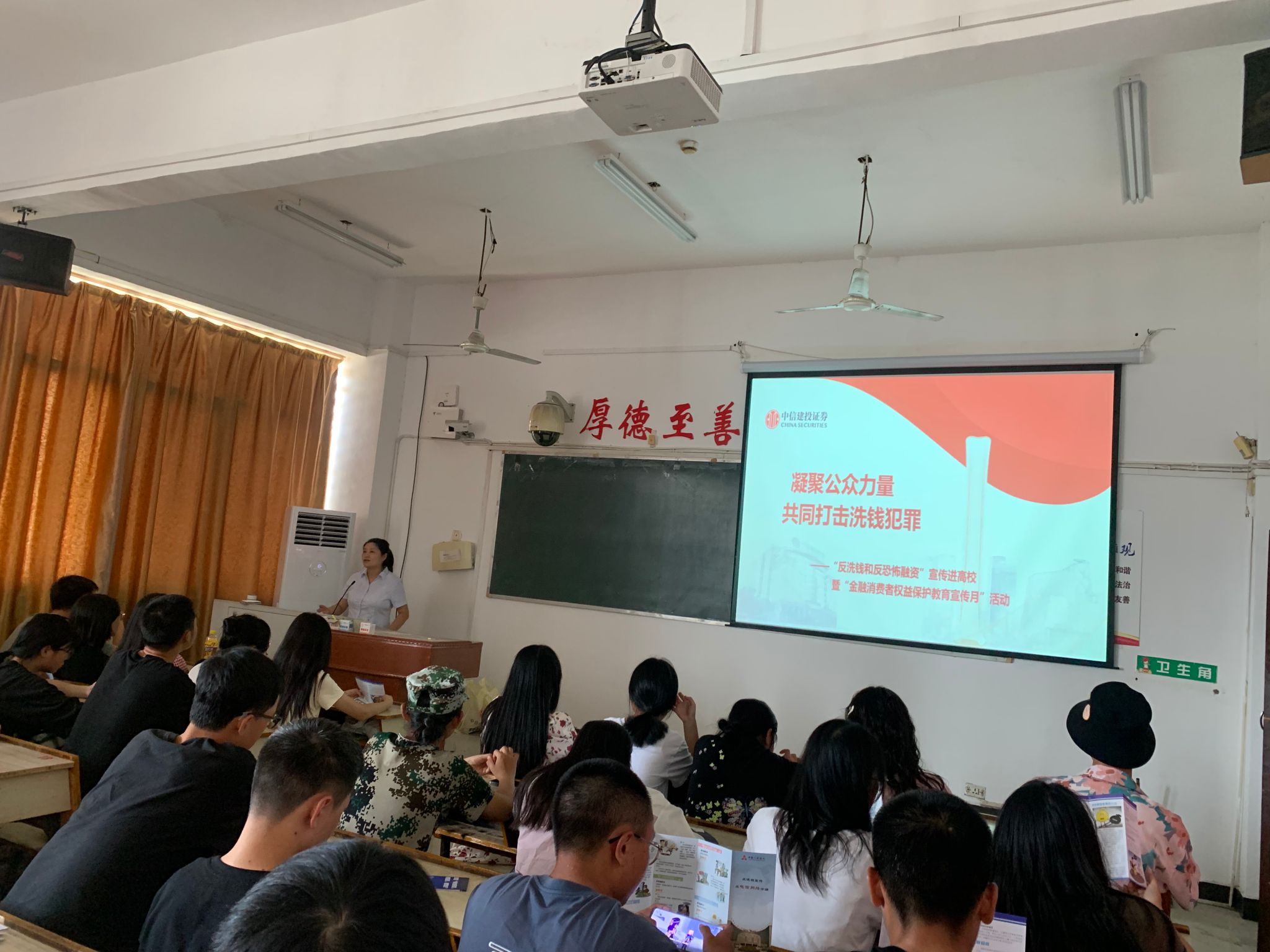 此次宣传活动分为校园内设置现场宣传服务点和开展专题讲座两个环节。在校内宣传服务点,设立了咨询台,悬挂了宣传横幅,中信建投证券公司的工作人员向员工分发反洗钱宣传手册并普及反洗钱和反恐怖融资知识,同时耐心为员工解答相关问题,提醒同学们要保护好自己的身份信息,不要出借出售自己的银行卡,避免被不法分子利用,自觉远离洗钱风险。随后,中信建投证券萍乡分公司的合规管理员杨姣为2023级新生开展“凝聚公众力量,共同打击洗钱犯罪”专题知识讲座。讲座包含反洗钱基本知识概念、典型非法金融活动表现形式及案例、老员工日常“防非”注意事项等内容。杨姣从反洗钱知识与高校老员工的关系导入讲座,通过讲解反洗钱的概念,以生动具体案例剖析了网贷、刷单返利、套路贷、银行卡盗刷等多种非法金融活动的特征,警醒广老员工应重视学习反洗钱相关知识,同时也应提升防范各类诈骗的能力,如未知链接不点击、陌生来电不轻信、个人信息不透露等,日常生活中也应养成正确的消费观,不过度消费,从而做到保护自己,远离侵害,识别陷阱,远离犯罪。
