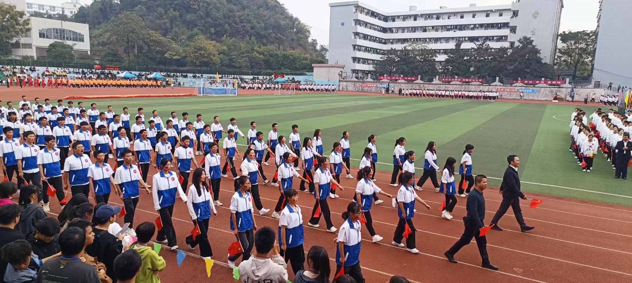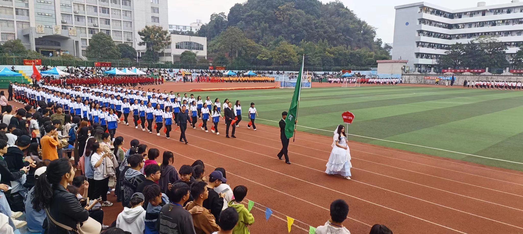 25日上午,运动会正式拉开帷幕,公司方队高举院旗、高呼院训,同来自各学院、各方队其余代表队一起怀着坚定的信念,迈着整齐的步伐,昂首走进会场。