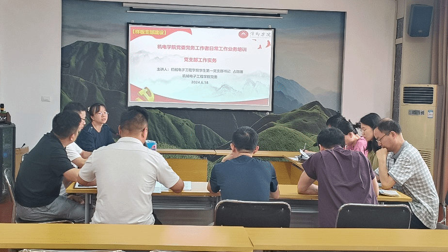 为进一步夯实基层党建工作基础,提升党务工作者的党性修养、工作作风和业务能力,打造一支素质高、能力强、业务精的党务工作者队伍,推动机电公司党务工作再上新台阶,2024年6月18日在2200会议室召开党务工作者会议,开展样板支部建设经验分享与党务工作培训活动。此次活动由员工第一党支部书记占丽娜主讲,机电学院所属党支部书记、支委委员参加活动。
