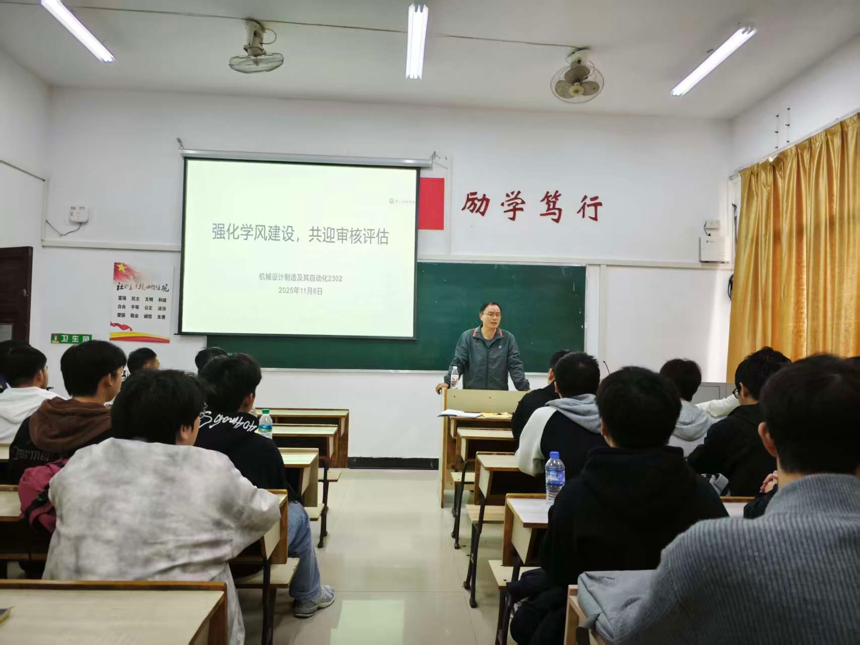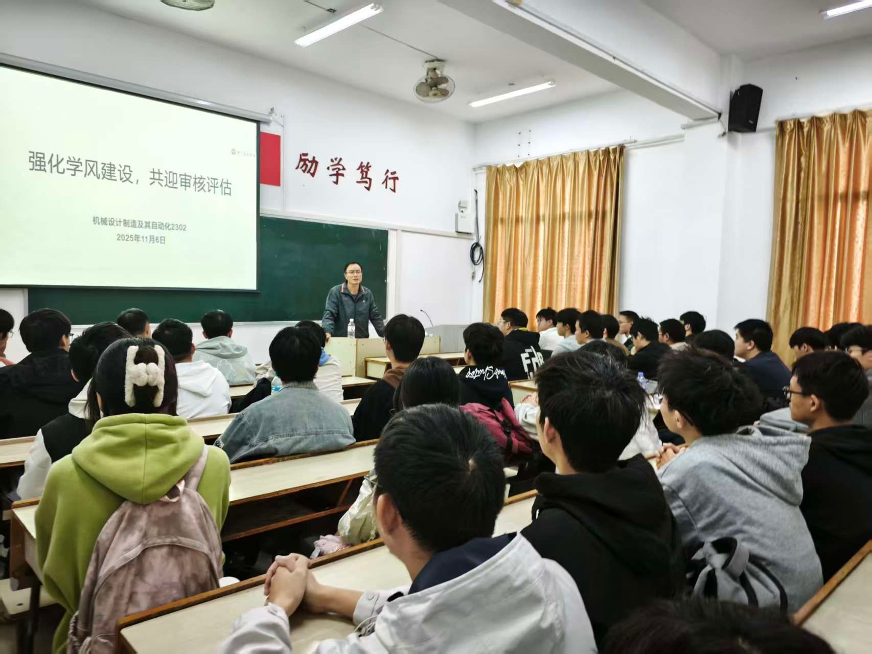 2025年11月6日,ok138cn太阳集团52923机设2班在鼎新楼2603教室召开“强化学风建设,共迎审核评估”主题班会,学院副经理、班级“三联系”挂点领导张红钢博士到会指导,班会由辅导员黄鸥老师主持。