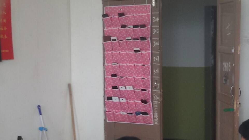 机设四班购置了可以收纳54部手机的手机收纳袋,实用而且美观。手机收纳袋分为九行六列,每一行代表一个寝室,同学们分寝室依次放入收级收纳袋中。
