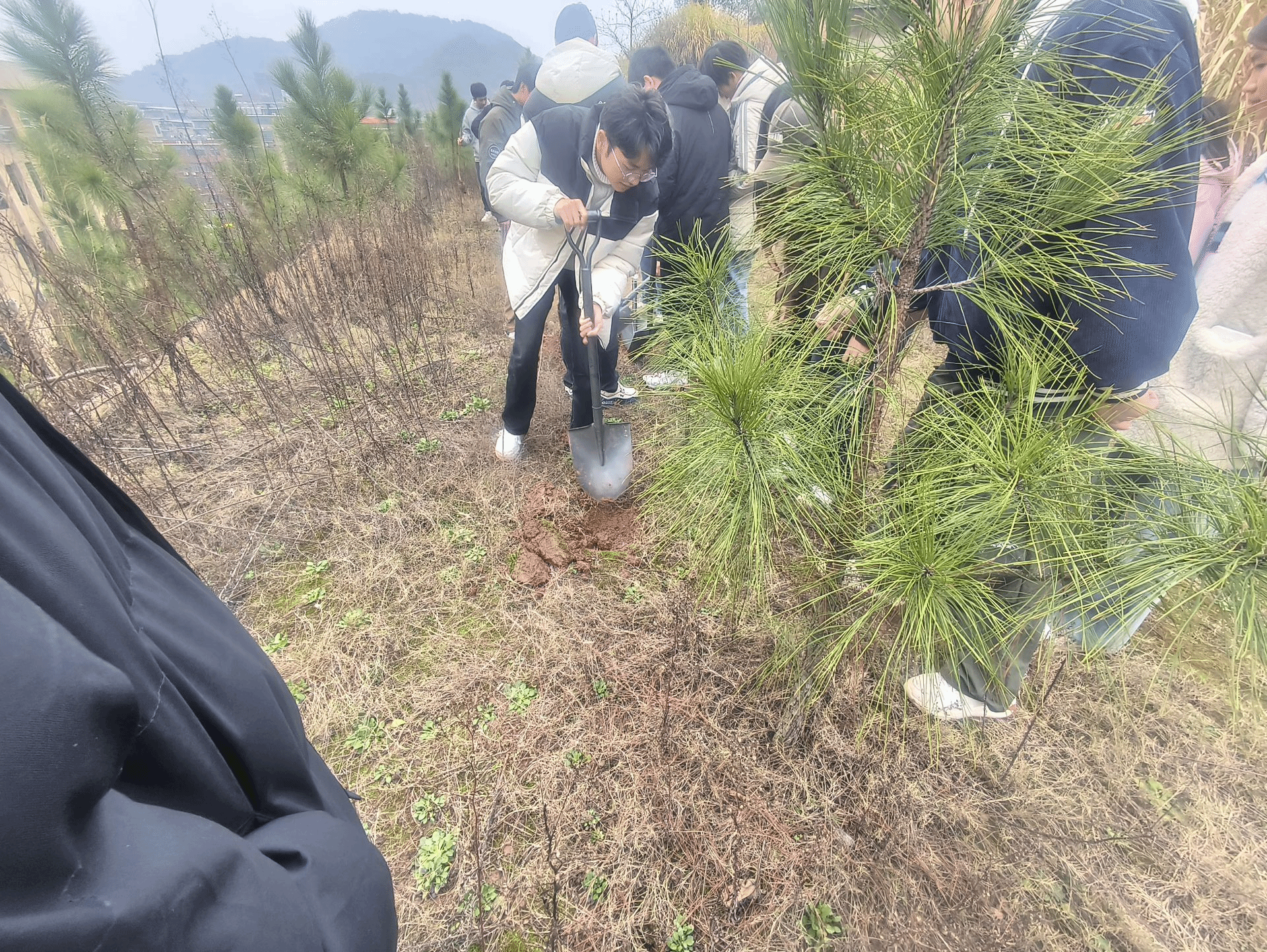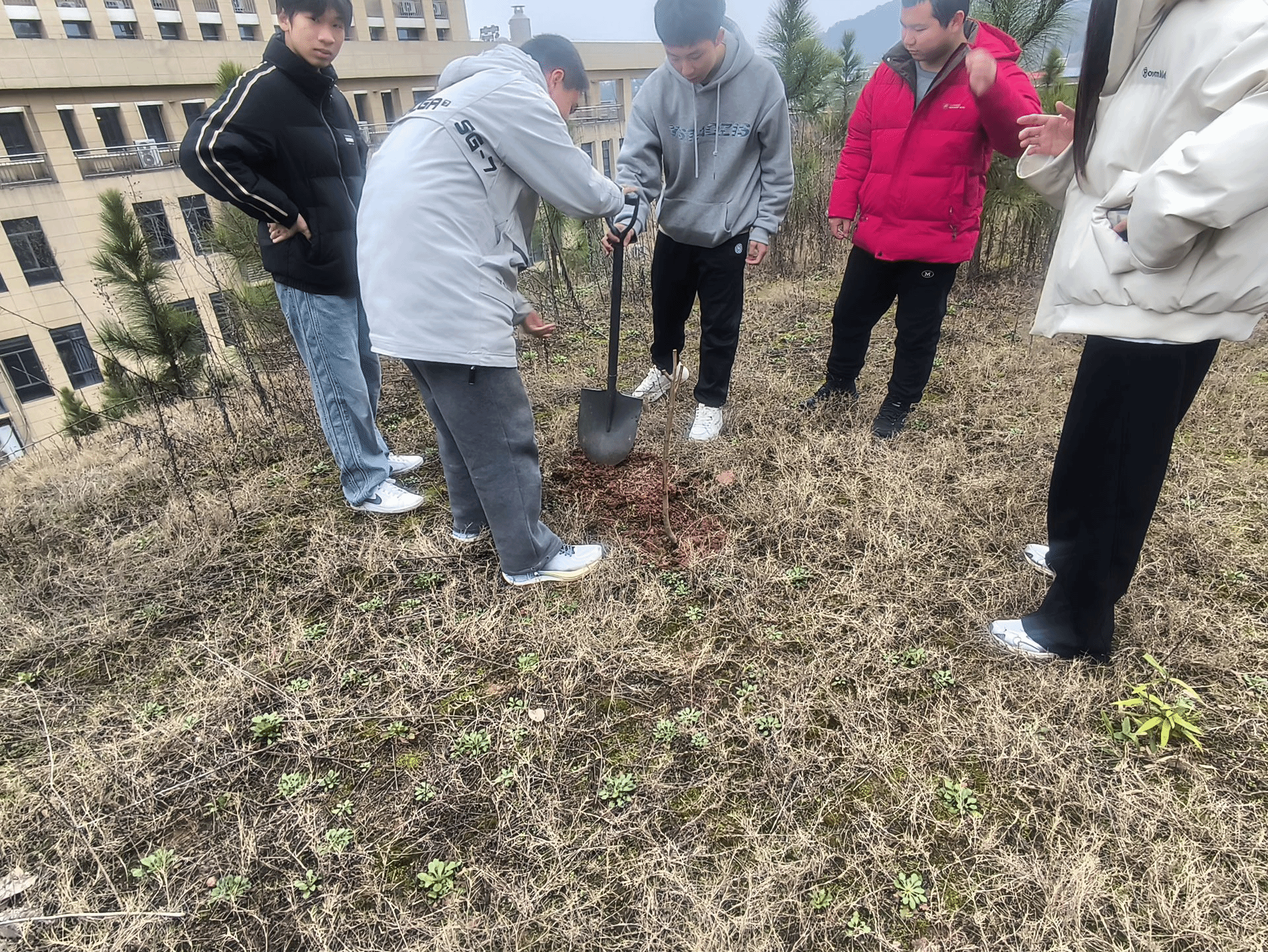 在至善楼后面的植树现场,老师和同学们分工协作,默契配合,共同挥锹铲土,挖出一个个合适的土坑,为种树做准备。经过员工们的辛勤劳动,一棵棵小树苗迎风挺立,为校园增添了一抹靓丽的色彩。此刻,大家脸上洋溢着憧憬与期待,当来年小树苗茁壮成长,那挺拔的“身影”定会让种树人感到骄傲。植树节,在校园里有着独特的意义。它是一堂生动的自然教育课,课本上抽象的植物知识,在亲手植树的过程中变得鲜活。当我们拿起铁锹,铲起泥土,种下树苗,便与大自然建立起直接的联系,深刻理解生命成长的不易。