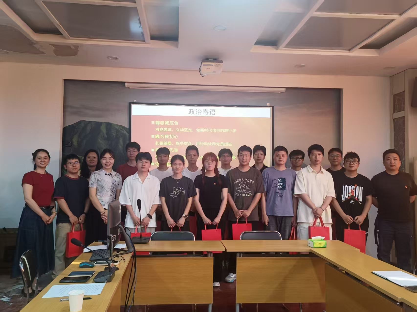 活动最后,支部为毕业生党员送上“政治生日”礼物——本镌刻着党支部名字的红色笔记本以及纪念钢笔,并集体合影留念。毕业生党员纷纷表示,将带着党组织的嘱托,以青春之我践行“强国有我”的誓言,让党旗在人生新征程上高高飘扬。