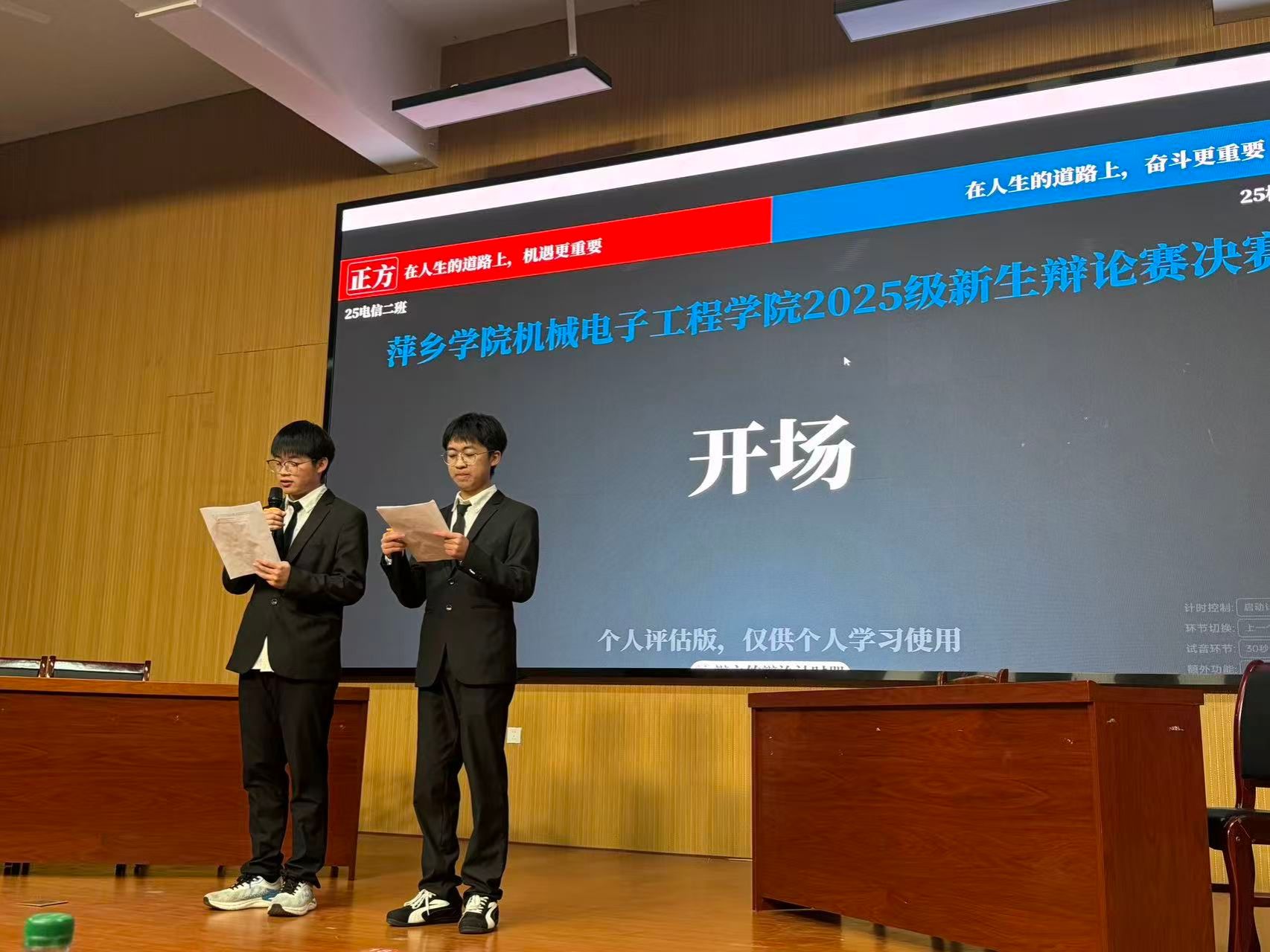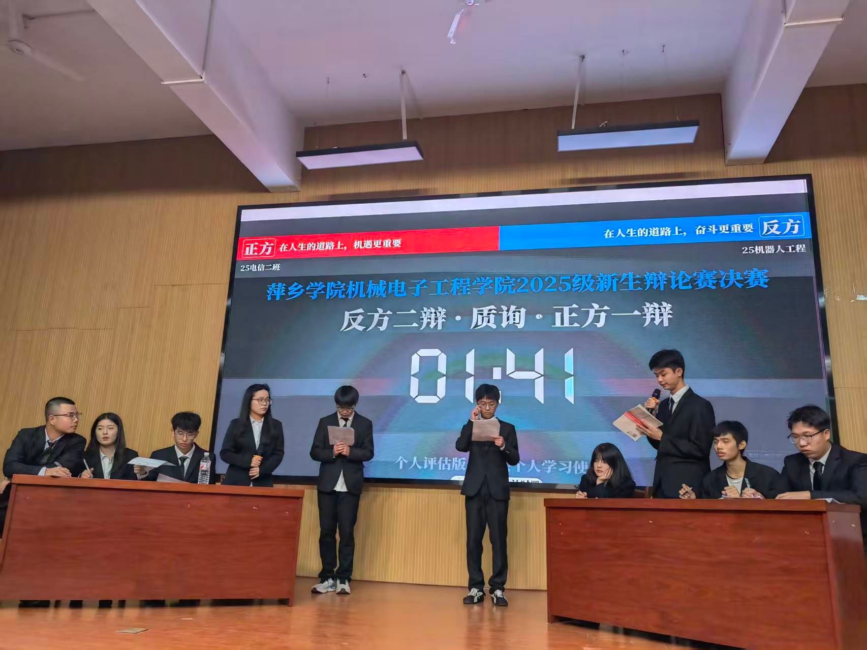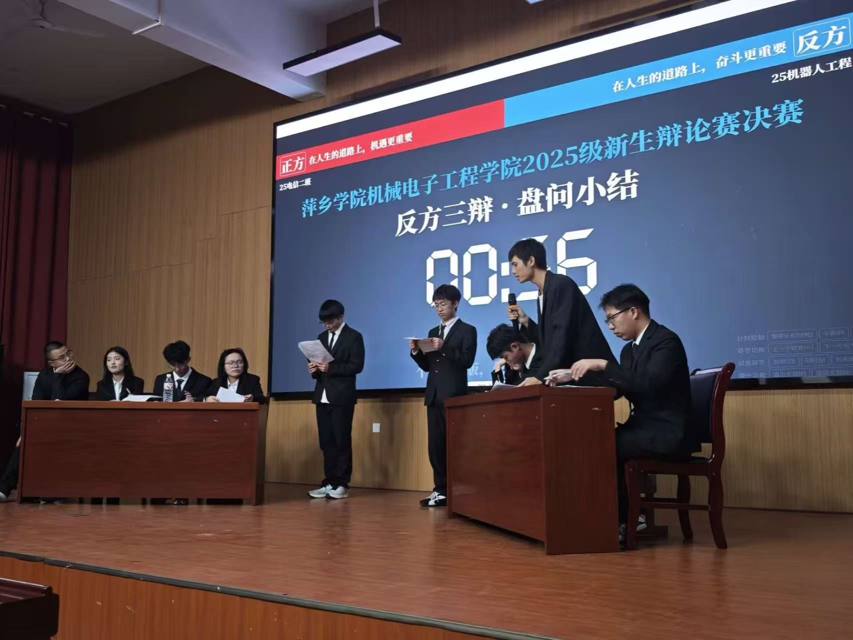 经过多轮激烈角逐,25电信2班与25机器人工程班从众多参赛队伍中脱颖而出,展开了一场巅峰对决。本次决赛以“在人生的道路上,机遇更重要还是奋斗更重要”为辩题,辩论过程涵盖立论与质询、申论与驳论、指定攻辩、双方盘问、盘问小结、自由辩论与总结陈词环节。比赛伊始,正反双方各执一词,于观点交锋中铺展思辨脉络。面对对方的犀利盘问,双方辩手随机应变、从容不迫,队员之间通力合作,多次巧妙化解危机。自由辩论环节堪称全场高潮,双方辩手逻辑缜密、妙语连珠。双方辩手敏捷的思维、伶俐的口才与扎实的论证功底,不仅展现了高水平的辩论素养,更引发了现场观众的深度思考,掌声此起彼伏。