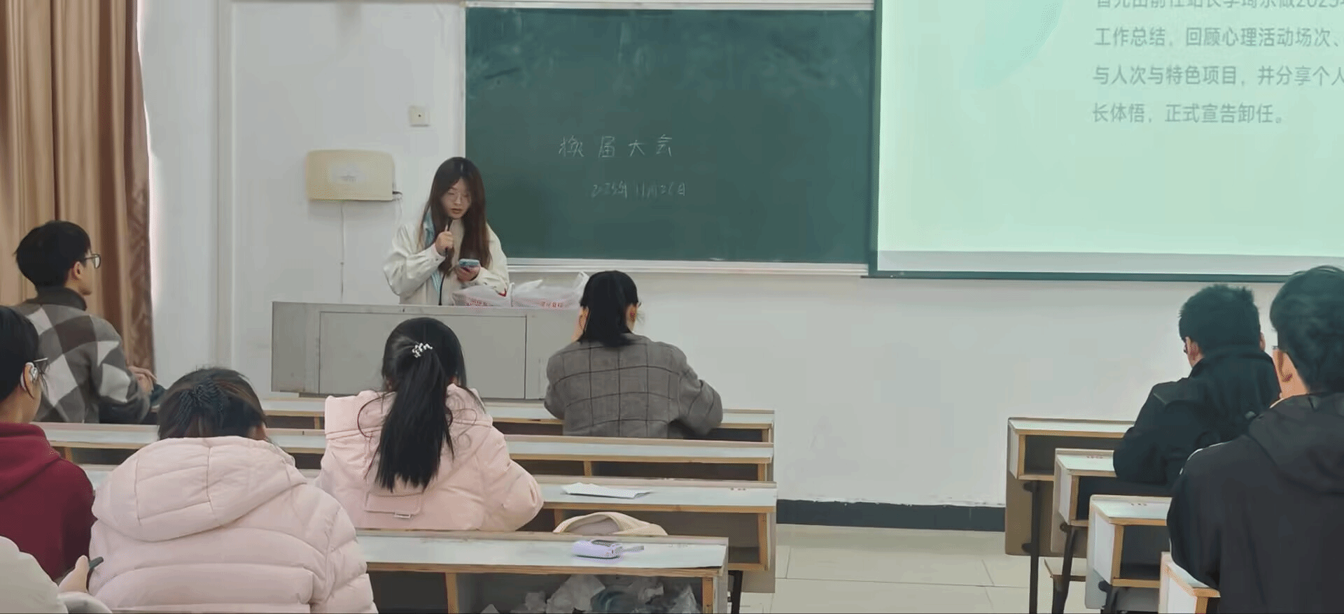 大会伊始,主持人致开幕词,详细介绍了到场嘉宾,并阐明了本次换届大会对于心理站传承发展的重要意义,拉开了大会的序幕。随后,前任站长李琦乐上台作 2025 年工作总结及卸任演讲。她全面回顾了过去一年心理站在心理健康知识普及、特色活动开展等方面取得的丰硕成果,同时客观指出了工作中存在的不足,并对新成员寄予殷切期望,希望大家能坚守初心,续写心理站的精彩篇章。